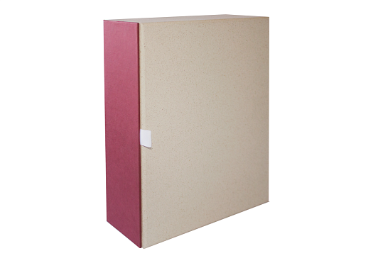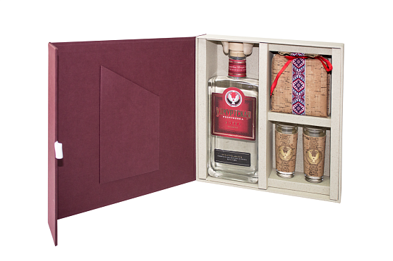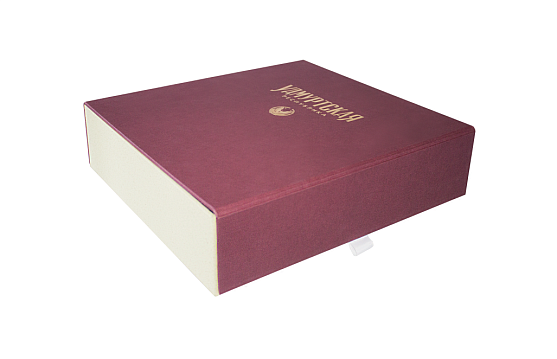 Размеры: 285*270*75 мм. В оформление упаковки используется обложечный картон, дизайнерская бумага, микрогофрокартон, фольга для тиснения. На лицевой части крышки, обернутой бордовой переплетной бумагой логотип вытиснен золотой фольгой. Крышка коробки дополнена магнитами и хлястиком для удобства открывания. Внутренняя часть короба с перемычками под вложения собрана из обложечного картона и микрогофрокартона, обернутых в дизайнерскую крафтовую бумагу с вкраплениями травяной и деревянной массы.