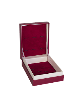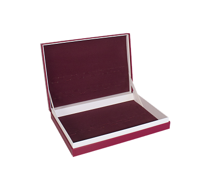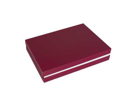 Кашированная коробка крышка-дно имеет прочную конструкцию. Нижний и верхний короба соединены между собой с помощью шарнира и ленты, которая ограничивает открывание коробки. В качестве держателя столовых приборов используется кашированный картон, прошитый шляпной резинкой. Держатели в крышке и дне полностью идентичные. Геометрические размеры коробки обеспечивают свободную постановку и выемку столовых приборов из упаковки.