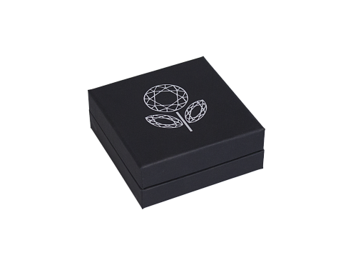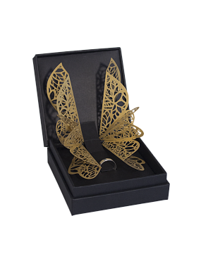 Коробка выполнена в виде шкатулки, 100*100*40 мм. Внутри крепится картонный ложемент. Ювелирное украшение плотно вставляется в прорезь. Имеется декоративный элемент-бабочка, выполненный с помощью лазерной резки.
