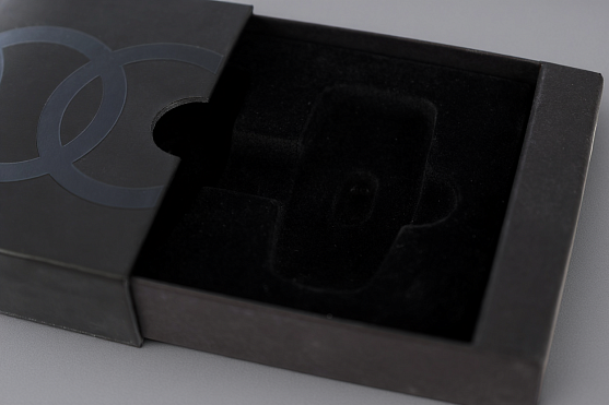 Упаковка подарочная с формованным ложементом. Размеры: 195*120*35 мм. В оформлении упаковки используется дизайнерская бумага, покрашенная в массе и ламинированная термоламинационной ультраматовой пленкой. Поверх ламинации нанесен логотип компании выборочным глянцевым лаком УФ утверждения. Внутренний короб оснащен формованным пластиковым черным ложементом, удерживающим вложение.