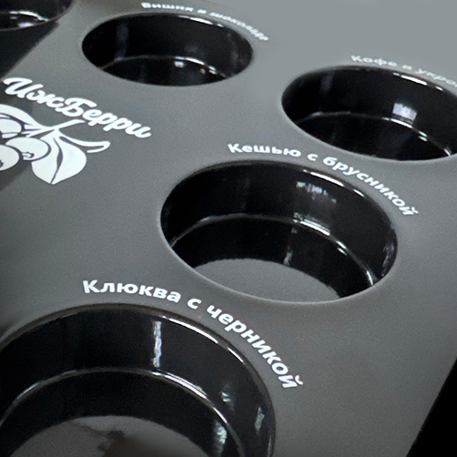 Формованный ложемент из глянцевого пластика с шелкотрафаретной печатью — это вкладыш для фиксации предмета внутри упаковки, изготовленный из пластика методом вакуумной формовки и декорированный изображением методом шелкотрафаретной печати (шелкографии).